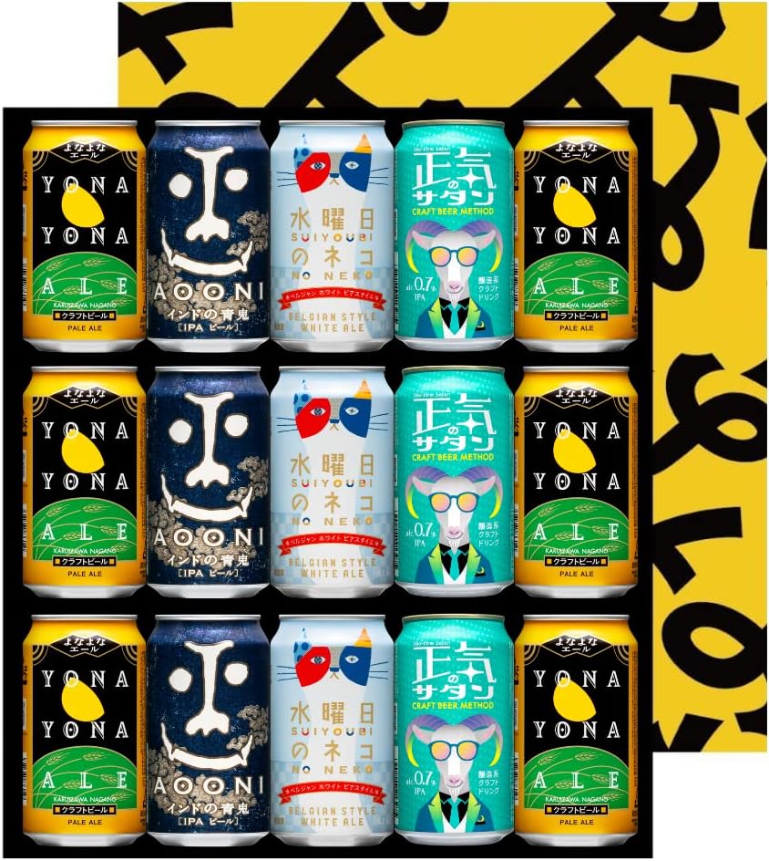 ヤッホーブルーイングの「よなよなエール」を含む人気銘柄の飲み比べセットは、クラフトビールギフトの定番です。